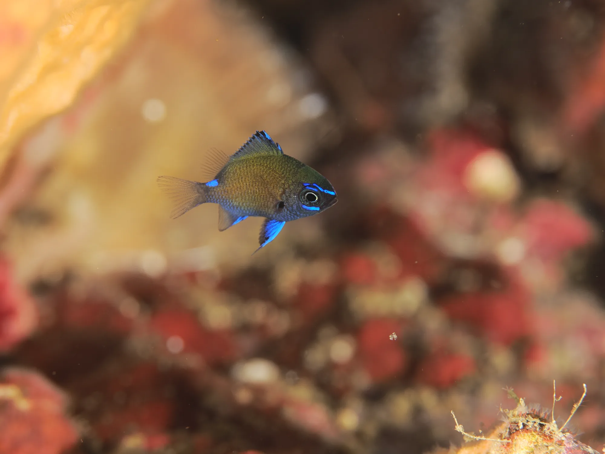 動き回るアマミスズメダイyg。1.5cm位のこのサイズが一番かわいい。 90㎜マクロ(35㎜換算180㎜)で狙うのは至難の業ですが、じっくり粘って頂きました。